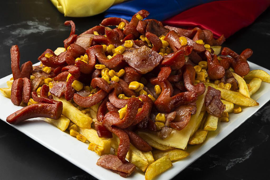 Patatas fritas, salchichas, queso, beicon y maíz dulce desgranado.